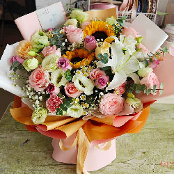 :19朵玫瑰混搭(粉玫瑰、紫玫瑰、香槟玫瑰),2朵向日葵,…