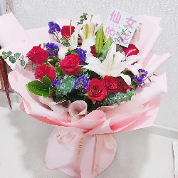 :11朵红玫瑰,2支粉色多头百合,勿忘我、尤加利搭配;粉色…