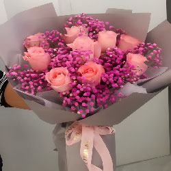 :9朵粉玫瑰,粉色勿忘我搭配;灰色雾面纸圆形包装,肉粉色丝带束扎;