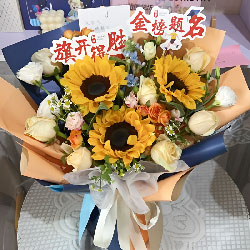 :8朵香槟玫瑰,3朵向日葵,桔梗、多头玫瑰、尤加利、蓝心花…