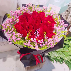 :19朵红玫瑰,周围黄英、粉色满天星、栀子叶搭配;黑色平面…