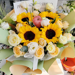 :10朵香槟玫瑰,6朵白玫瑰,4朵向日葵,桔梗、喷泉草或尤…