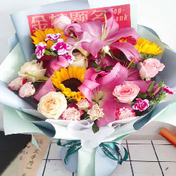 :19朵戴安娜粉玫瑰,6支白色多头百合,粉色满天星、黄英丰…