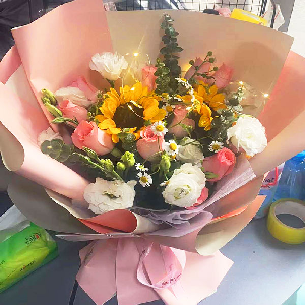 4、送花地址:北京朝阳区胜古中路2号院5号金基业大厦附近,花材:30朵粉玫瑰,6朵向日葵,6朵白色百合,桔梗搭配,尤加利丰满。