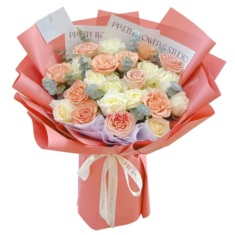 花材:22朵玫瑰混搭(11朵白玫瑰,11朵卡布奇诺玫瑰),尤加利搭配;